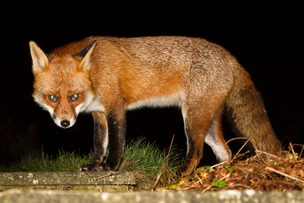 | 0401130301132423 | Mature male fox (Vulpes vulpes) standing on stone path in a garden and displaying distinctive pale blue eye-shine caused by light reflecting on the tapetum lucidum which is behind the retina and amplifies light enabling good night vision. East Sussex. | ||||||||||||