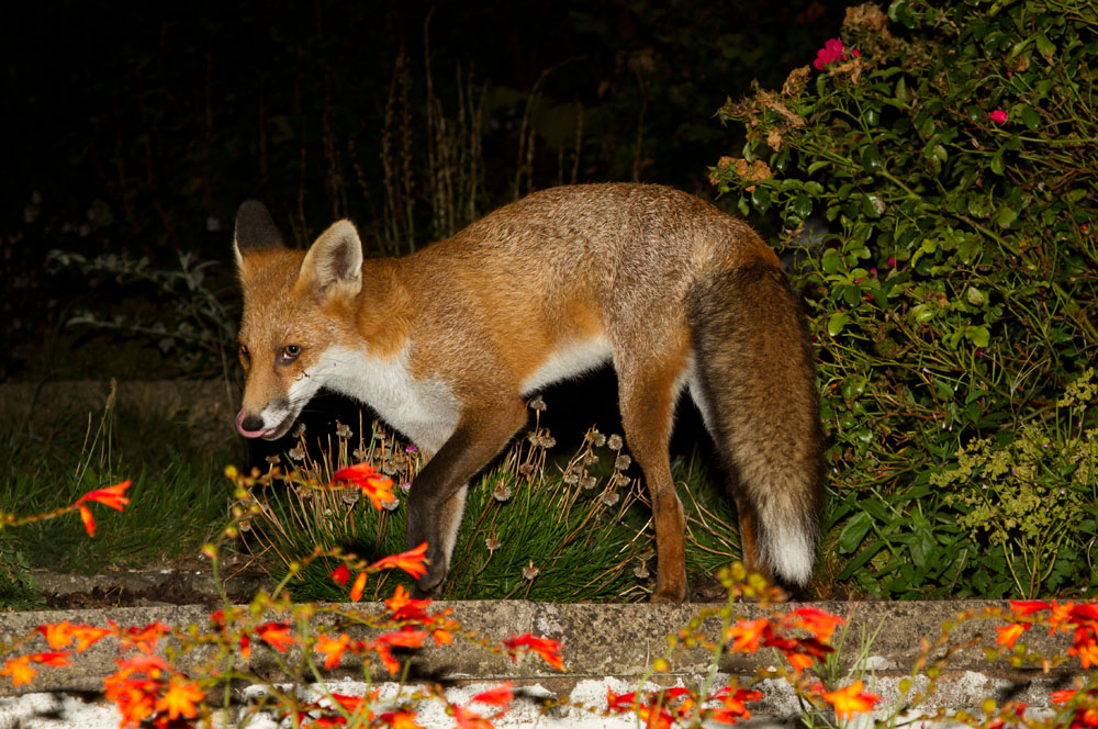 | 0909120709122076 | Juvenile fox stepping along a path in front of flowers. | ||||||||||||
